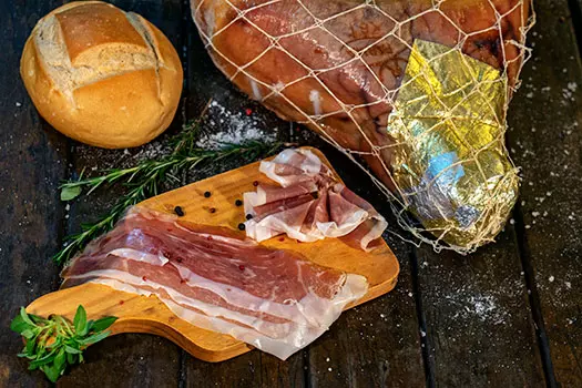 Feito com pernil suíno, sal e maturação de 12 meses, levemente defumado. Carrega uma nobreza incomparável.